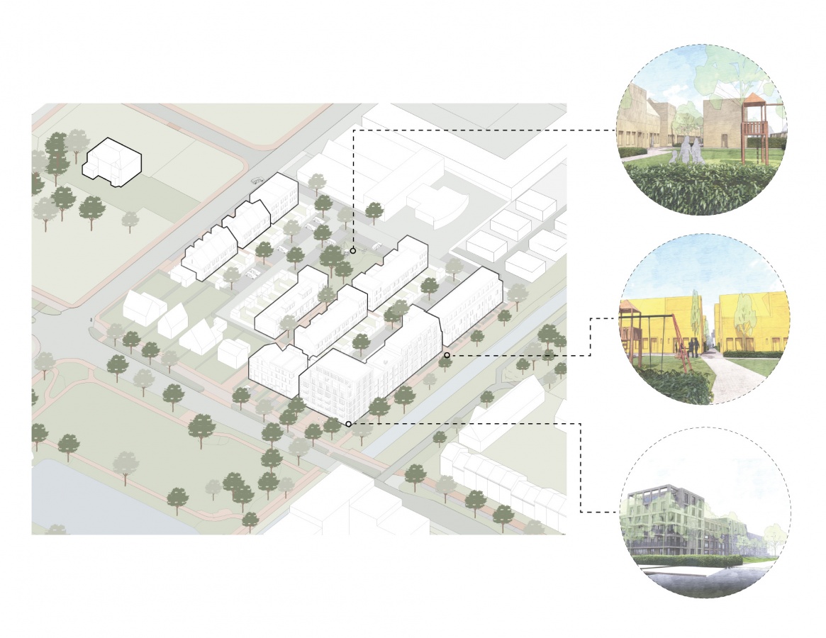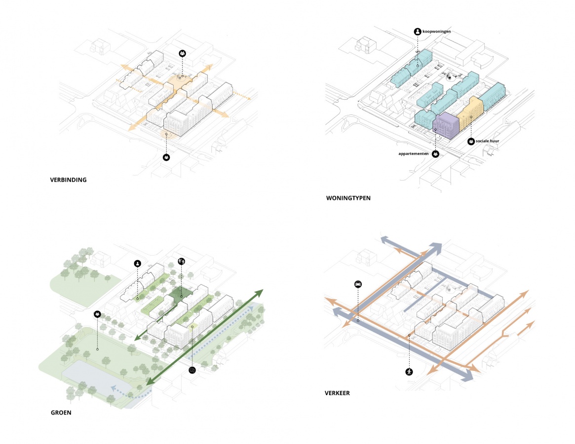 The site occupies a distinctive location on the corner of Kruisweg and Boslaan, close to the center of Hoofddorp. Behind the houses along Kruisweg currently lies a hidden world of warehouses and industrial buildings. This existing business area will be transformed into a residential neighborhood. At this point, the larger scale of developments such as Gemaalhuis and Hyde Park transitions into the smaller grain of detached houses along the historic axis of the Kruisweg, leading toward the town center.