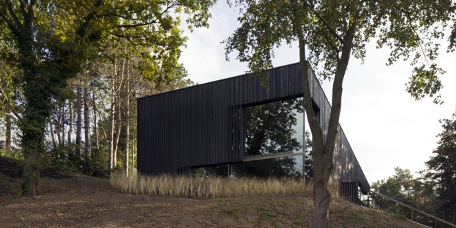 Het huis is aan de buitenkant volledig bekleed met zwarte houten delen. Het hout is bewerkt volgens een Japanse brandmethode, een duurzame manier om hout te conserveren. Het zwarte oppervlak lijkt telkens te veranderen door het licht. Soms valt het huis weg ten opzichte van de donkere bosrand, soms schittert het in de zon vanwege het glinsterende verkoolde hout, en dan weer vormt het een achtergrond voor het schaduwspel van boomstammen en takken. Het huis is gecamoufleerd en valt tegelijkertijd op.