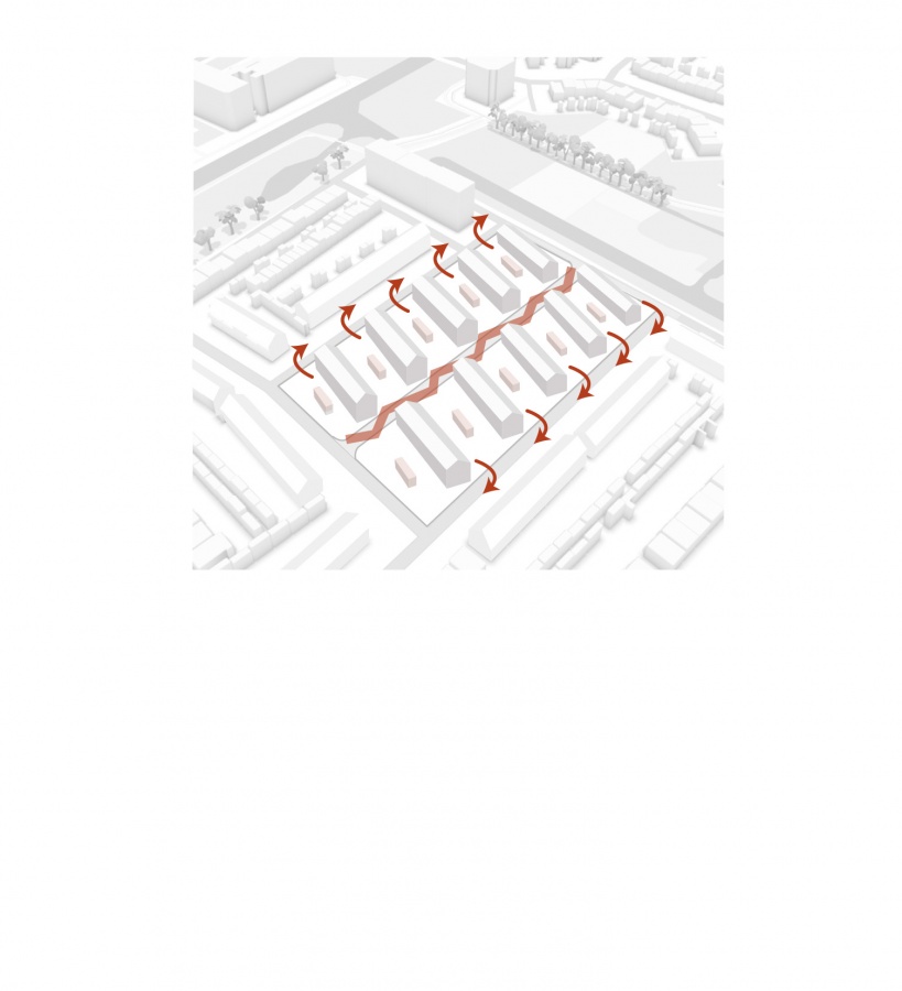 Door in de straatprofielen veel ruimte te maken voor groen, de bouwvolumes te breken met setbacks en voldoende zonlicht in het binnengebied toe te laten, is een ensemble ontstaan van ogenschijnlijk zelfstandige woongebouwen. Hierdoor kan elk gebouw reageren op zijn positie in de wijk. Het project voegt zich daardoor vanzelfsprekend in de omgeving, zonder zich te verstoppen.