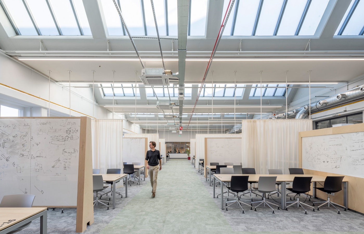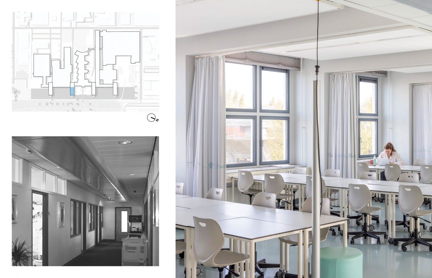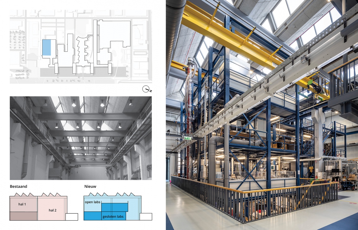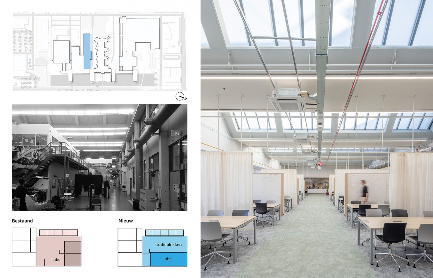 Het gebouwencomplex uit de jaren ’60 heeft deels een monumentale status, dus is de opgave ook om bij al deze veranderingen het karakter van het gebouw recht te blijven doen. Eenvoudige organisatorische principes helpen om de helderheid van het gebouw te versterken. Stapeling van functies maakt dat een industriehal met sheddaken enerzijds de gewenste nieuwe labfuncties als Clean room en Drone lab kan huisvesten, maar ook een prachtige studieruimte met rijk daglicht oplevert.